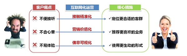 互联网化转型是销售导向往运营导向的转变,最终目的在于全面提升客户体验。深入分析电话营销渠道客户声音,佛山中心定位三大痛点:一是不便接听,客户在开车、会议等不方便通话的情况下接到营销的外呼来电时只能挂断;二是不合心意,客户近期对4G融合套餐优惠感兴趣,外呼营销时却推荐了预存话费的优惠;三是不易体验,外呼主要以声音传递信息,对于终端、套餐等复杂业务,客户靠听难以在脑海中勾勒业务全貌,无法引起购买欲望。