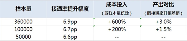 进入大数据时代,对于样本规模的考量往往只有一个答案——无需抽样,直接使用全量数据。站在实际运营的角度,样本规模越大,意味着数据处理、模型搭建等各环节需要投入的时间和精力越多,模型对于业务变更的响应速度越慢。是否真的有必要使用全量数据?缩减样本规模是否也同样可以实现精准识别?我们尝试使用5万、10万和36万3个不同规模的样本搭建判别式模型,从图3可见接通率提升幅度与样本量呈正相关关系,对“大数据”的强调存在统计意义上的合理性;但从成本和产出的增速来看,600%的额外投入仅能带来3%的提升。其中的得与失目前并无统一的评判标准,建议呼叫中心决策者依据企业实际情况,具体问题具体分析(如图3)。