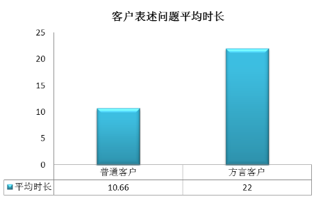 地市方言较难听懂,影响员工理解客户诉求,本次听取800条录音中36条方言较重,占比4.5%。针对客户咨询的同类问题,普通话客户来电员工理解问题平均时长为10.66秒,方言客户来电员工理解问题平均时长为22秒,由此可以看出使用方言咨询的客户诉求不便于员工理解(如图2)。