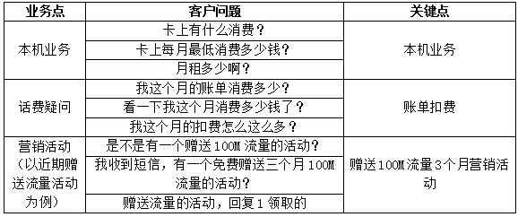 客户来电咨询话费账单问题时首先会询问“你看我这张卡上有什么业务?”“我刚才充值的话费充上了吗?”“我的话费余额多少?”在这种情况下,员工要针对客户诉求进行答复,但实际上客户是对本机话费有疑问,客户多样化的询问方式影响了员工理解客户诉求的时长。