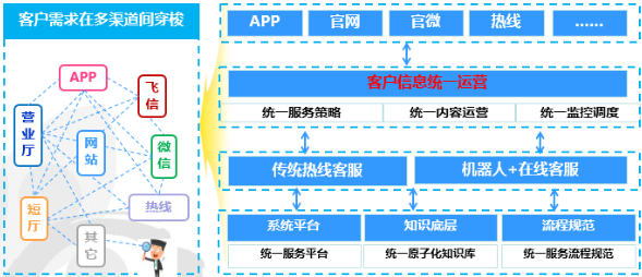 其次说系统。笔者认为,要做服务融合,对原有系统升级改造,坚持各服务模式使用同一套系统。重点以两个系统为例,一个是接续的客服系统,一个是知识库系统,监控报表等其他系统都是类似的。升级同一套客服系统,实现热线、在线的统一登录和灵活切换,让同一个座席既做语音服务又做在线服 务,系统的底层应该是一致的,只是在系统界面的UIUE 设计上和辅助工具上有区分就可以了,这样可以实现技能的灵活切换和资源复用,也可以保证底层的报表信息一致,系统的查询、办理功能一致,系统的逻辑结构一致,也便于前台熟练操作和后台维护;我们要使用同一套知识库系统,它可以支撑智能机器人服务和人工服务,尤其是知识底层应该是一致的,不仅大幅降低了维护成本,而且确保了面向客户端的服务输出是一致的,不会出现各自渠道自说自话的问题注。