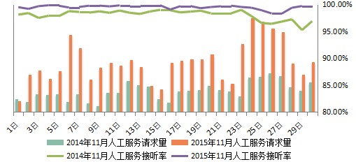 因2014年10月完成全网全业务集中运营,为具有可比性,选取2015年11月分中心数据与去年同期对比,下图为2015年11月与2014年11月分中心人工服务请求量与人工服务接听率两个话务指标的变化趋势图,在话务量月均提高32.76%的情况下,人工服务接听率月均同比增长1.47个百分点。