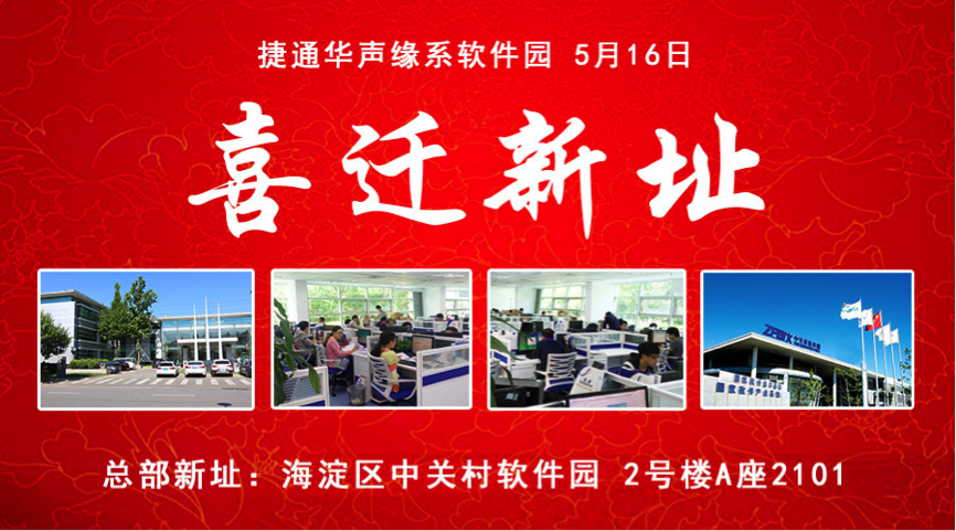 由于公司发展需要,捷通华声北京总部于5月16日正式搬迁至新办公大楼,地址:北京市海淀区中关村软件园2号楼A座2101。
