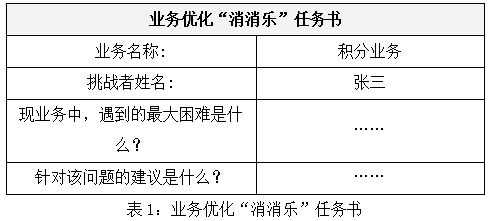 一线员工这个渠道的意见是最接地气的,因为他们直接接触客户,对客户服务痛点有着最深刻的感受。通过开展专题活动,以任务挑战书的形式调研员工心声。任务挑战书,结合了当下娱乐节目流行的开展形式,配合一整套评比、竞争激励方案,鼓励员工众筹众创,积极参与到流程优化工作中来,提出服务工程中的业务痛点以及优化建议(如表1)。