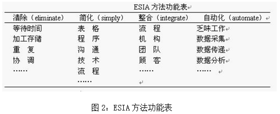 通过业务优化审核会议,针对业务优化问题诊断书中的问题及优化建议进行审核,使用ESIA分析法评估,确定业务问题的优化实施的可行性。ESIA分析法,即取消(Eliminate)、简化(Simply)、整合(Integrate)、自动化(Autimate)(如图2)。通过ESIA分析法,敢于打破现有流程的思维局限,对不必要的业务知识、流程进行清除,繁琐的进行简化,分解的重新整合,并在此基础上,由系统自动化替代人工操作。