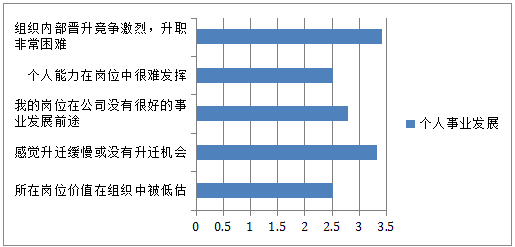 针对个人事业发展的调查,从图1中可以看出,“组织内部晋升竞争激烈,升职非常困难”、“感觉升迁缓慢或没有升迁机会”是引发后台员工压力的两个来源,这两项均与个人职业发展路径相关,表明后台员工对个人职业发展存在困惑。