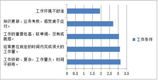 从图2的调研结果上看,“工作琐碎、复杂,工作量大,时间不够用”、“经常要在规定的时间内完成很大的工作量”、“工作的重复性高、较单调,没有成就感”这三项是引发员工工作压力的来源,指向对后台人员工作量、工作强度的关注。