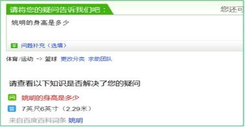 自动应答系统给某个提问提供简单而精确回答,与信息检索任务有很大的差别。目前的信息检索系统能让我们对与提问切题的相关文献进行定位,把从文本的关键字匹配中抽取到的答案的呈现给用户。在信息检索中,相关文本的识别是使用将提问与文献集匹配的方法来实现的,信息检索系统并不负责回答用户的问题。信息发现与信息检索不同,信息发现需要理解用户的语意,并找到正确的答案–答案和提问之间通常并不存在关键词上的直接匹配。以百度提问为例,一个典型的自动应答的答案应该如图1所示。