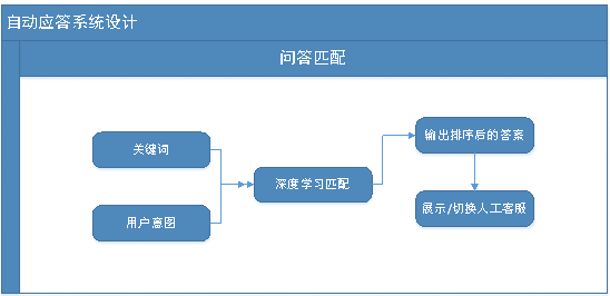 根据用户的意图分类,以及关键词,使用深度学习进行答案匹配,整个匹配过程是一个分类过程,返回按正确度或匹配度倒序排序的答案列表,将匹配度最高的答案呈现给用户。如果不存在匹配的答案,则将问题切换至人工客服。比较关键的一点是在使用关键词进行匹配时需要同时考虑语义相同的词语,例如客户在提问“收益最高的理财产品”,匹配的需要是“本利丰”等具体的产品。