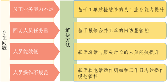 对部门存在的主要问题进行深刻 剖析,经过逐步摸索,部门最终探索出 通过深入剖析工单质检结果、合并工单明细、通话与案头时长、软电话动作明细和工作日志的这四个关键数据来制定和落实各项管理措施,以解决主要问题,提升部门运营水平(如图 1)。