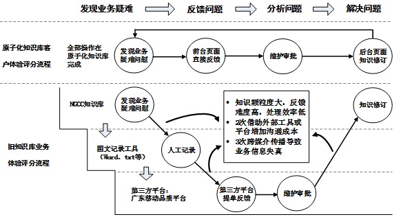 对比可知,旧的NGCC知识库完成一次完整的业务疑难反馈需要进行三次跨媒介业务信息传递、两次借助外部工具或平台、信息流路径复杂低效,这将产生三方面的不利影响:第一,业务信息多次跨媒介传播失真,后台维护人员不能如实按一线需求更新知识点;第二,长期借助多种外部工具或平台将大大提高沟通成本;第三,业务疑难反馈的信息流路径不够精简,花费大量时间成本,业务疑难信息得不到及时更正还会引发发酵式的客户投诉。