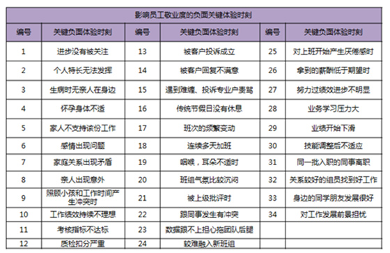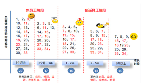 2、从员工各个成长阶段的负面情感体验时刻点分布来看,有部分情感体验时刻点的分布是相对集中、高频出现的,比如编号为3、11、15、17、33和34等对应的情感体验时刻点,基本是在各个成长阶段的员工容易产生的,笔者认为,这些高频出现的情感体验时刻应该员工感知度较高,共性特征较强的点,结合MOT理论的借鉴,可以尝试定为关键点负面情感体验时刻点,这些体验点对于员工敬业度有着关键性影响,经过分类,可以把这些负面的关键体验时刻点总结如下(如图3).