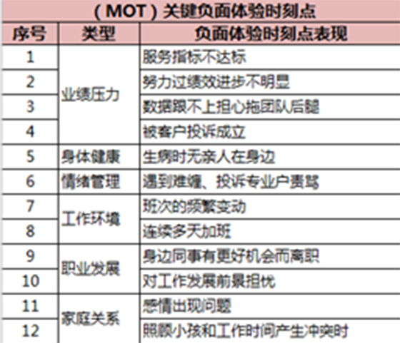 图1中这么多的负面体验时刻点,哪些是对员工敬业度起到关键性影响作用的?这个需要进一步去分析,MOT(关键时刻)的理论告诉我们,客户在整个服务体验的过程中,会记住某几个重要的体验时刻点,而那几个关键性的体验时刻点则会影响客户对整个服务过程的整体评价,因此改善那些对客户感知影响大的服务体验点对服务提升和流程改善效果更好。同样可以借鉴MOT的管理思路,找出一些影响员工敬业度的负面的关键时刻体验点,对提升员工的敬业度将会起到更有效的作用。
