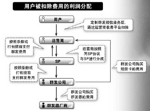 根据深喉的阐述,本报特绘制了不含技术实现方式的简单图表。图一:用户接收群发短信大致流程;二:用户被扣除费用的利润分配。