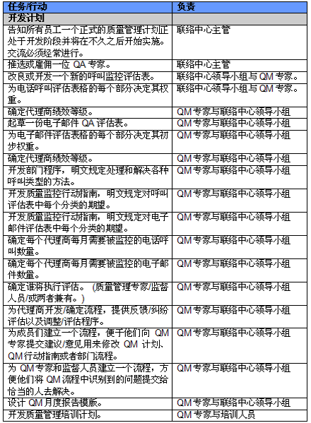 4. 开展项目交流。管理人员必须就新的或者修缮后的QM计划与代理商进行交流。QM的成功与否与代理商的合作密不可分,如果代理商受邀参与新QM计划的开发并且所有改变都在双方之间明确交流过,那么成功的机会也将大大提高。交流的内容应包括为什么要开发这样一个计划,它的作用和职责是什么,它对代理商会产生哪些影响(对于他们的评估和提升)以及它能带来哪些好处。帮助代理商认识到QM计划积极的一面很重要,因为只有这样才能让他们看到QM不仅仅是管理人员用来告诉他们做错了事情的一种手段。让联络中心全体员工参与QM计划的开发能够建立他们对该计划的支持,提高接受度的同时避免不知所措。这对联络中心刚刚崭露头角,QM计划还未全面铺开的中国市场而言尤为重要。