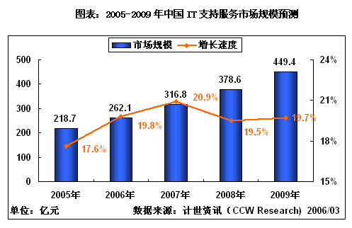 计世资讯(CCW Research)预测,在未来几年内,中国IT支持服务市场将保持平稳、快速增长的发展态势,2006年中国IT支持服务市场规模将达到262.1亿元,较2005年增长19.8%;2006-2009年的复合增长率将达到19.7%。中国IT支持服务市场的增长速度在2007年将达到最大,为20.9%,以后将逐渐放缓,预计2009年中国IT支持服务市场的增长速度为18.7%,市场规模将达到449.4亿元。