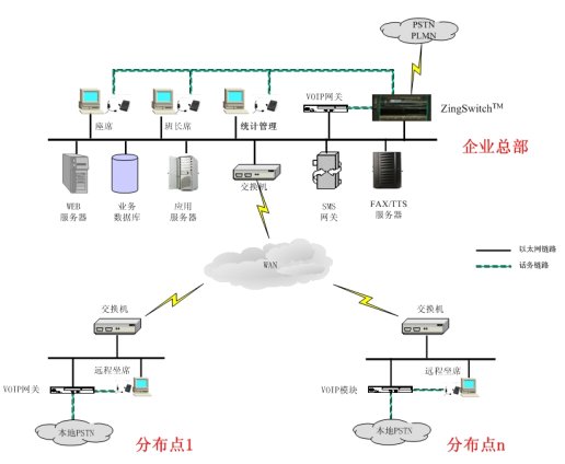 - 系统仍可同时在总部设立VoIP中心,用以实现数据和管理的集中,并且采用VoIP的方式,对各分布点的话务工作进行集中的监控。