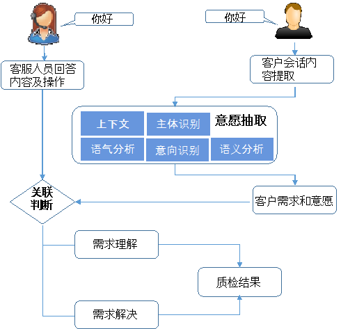 这上面所涉及的质检项如果不针对服务的对话内容及服务流程来做分析,单纯靠简单的关键字搜索匹配很难解决这么多问题。从服务的根本问题来看,服务就是为了解决客户提出的需求,而客服人员是否准确完整解决了客户的需求,这应该是服务质检的基础要求,但这个最基本的要求在当前普遍的智能质检应用中都几乎没有提及。再回到这个问题上,我们要如何去判断客服人员是否达到这一基本服务要求,其核心就是找出客户的意愿,然后去评估客服人员服务行为与客户意愿的一致性。客户意愿的直接体现就是与客服人员的对话内容,如果单纯去做语音特点分析或单纯的关键词搜索是无法有效提取客户的详细需求的,这是因为客户的习惯性描述往往非常口语化、零散、随性、简略,且前后表达往往具有关联意义,如果不能很好地对客户的“自然语言”进行有效处理和分析就无法准确捕捉到客户的真实需求并反馈給系统去评估客服人员的服务操作是否准确。当然,除了准确解决客户需求的基本服务要求以外客服人员的服务态度、情绪控制等服务表现也是服务质量检查需要解决的内容,对于一个完整的智能质检系统来说这些问题同样需要解决,这就要求智能质检系统必须具备更高的技术处理能力,如情感分析、语义分析等(如图2)。