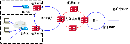 当大客户数量增加,MSTP网络具备一定规模的时候,可以考虑建设MSTP骨干网络,采用MSTP骨干节点来实现对宽带业务的调度、交换和汇聚,以减轻大客户中心MSTP设备的业务汇聚压力,也同时可以降低大客户中心对MSTP设备性能的要求。该方式比较适合于SDH网络需要扩容而采用MSTP覆盖大客户接入网络,本方式的网络结构如图5所示。