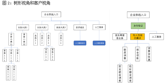 客户化视角一样需要引入到电话服务渠道中去,原先以企业的业务分割条块的树状IVR流程必须转变为以客户需求视角的客户场景模式,如下图所示:
