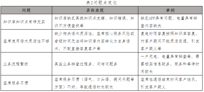 定位出了具体业务点和个人问题,还需进一步抽取相关录音,确定问题点。主要问题点如表2所示。