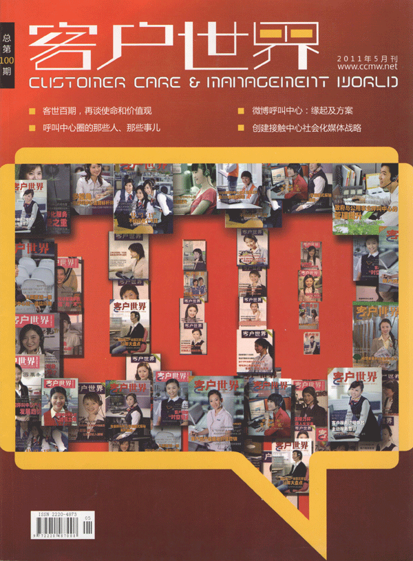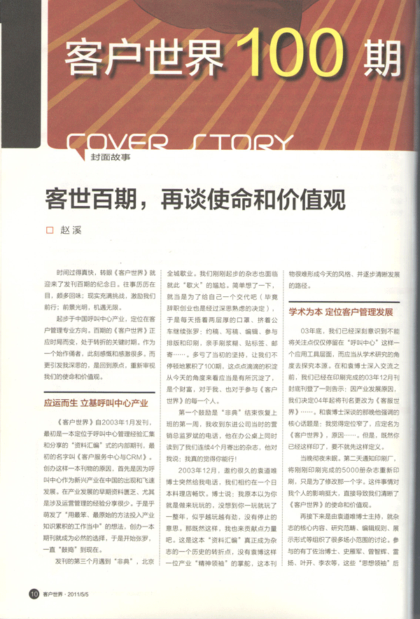 2011年5月,《客户世界》杂志出满100期。这是一个值得庆贺的里程碑!在这样一个时间点,客户世界机构的创始人赵溪先生专门撰文《客世百期,再谈使命和价值观》,文章冷静内敛、审时度势、高屋建瓴,受到了业界一致好评。