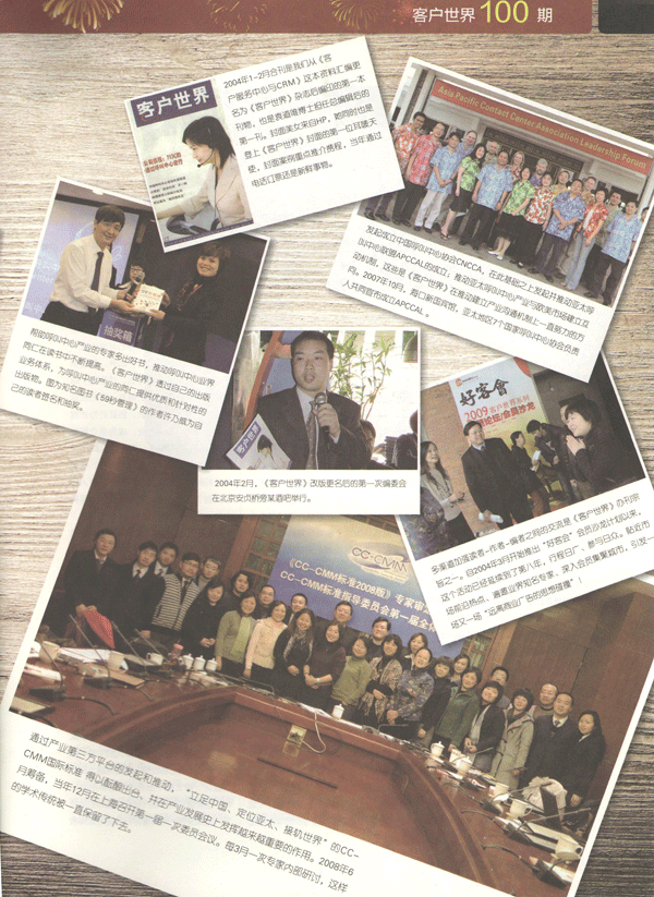 客户世界机构于2004年底发起创办中国呼叫中心协会CNCCA,于2006年推动创立亚太客户中心协会联盟APCCAL,2008年发起建立CC-CMM客户中心能力成熟度模型国际标准,并于2009年6月在复旦大学成立CC-CMM国际标准研究中心……。一路走来披荆斩棘,不忘初心砥砺前行。