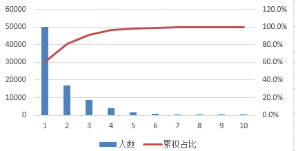 第二,对于流失客户,历史的投资笔数是个重要的区分依据。图1是客户投资笔数的简单的帕累托示意图,大家可以结合自己的情况看看是不是一样的情况。