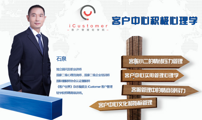 石泉:独立顾问及职业讲师,专注于客户中心积极心理学的研究、实践和知识传播。国家二级心理咨询师,国家二级企业培训师,国际催眠师协会认证催眠师。《客户世界》杂志编委及 iCustomer 客户管理轻学院特聘高级讲师。