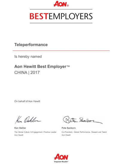 北京2017年11月– Teleperformance 集团,全球知名度外包呼叫运营商,多渠道外包客户管理的领导者,今天宣布了北京互联企信信息技术有限公司(Teleperformance China)荣获Aon Hewitt怡安翰威特评选的2017最佳雇主奖,这已经是连续第四年,荣获此项殊荣。怡安集团是著名的全球人才,医疗与退休解决方案专家。此评奖是在世界范围内被评测并被承认的关于雇主卓越表现的奖项。