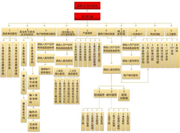 互联网购物崛起后客户联系客服的频率日益增强,作为客户的我每每拨通客服热线首先响起都是IVR语音甜美的问候,紧接着会迎来每一个细分业务的IVR语音指示,分别赋予从0-9每个按键一个业务类别,当客户按下相关按键后(很容易按错)满心期待客服人员解决问题时便又传来语音提示,是更进一步细分业务的语音提示,同样赋予从0-9每个按键一个业务类别,直到这一层面,客户的问题才有可能被解决,甚至有的企业还会设置第三层语音提示。图1、图2是两家企业的IVR流程图。