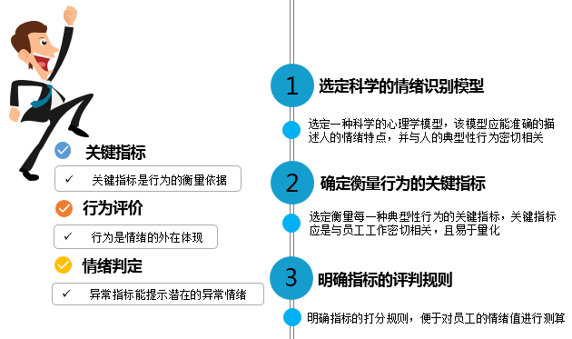1、评价依据创新:告别了以往单纯依靠主观观察、当事人主动提出发现异常情绪的办法,真正实现了基于工作指标表现、利用关键行为评价员工情绪的方法。