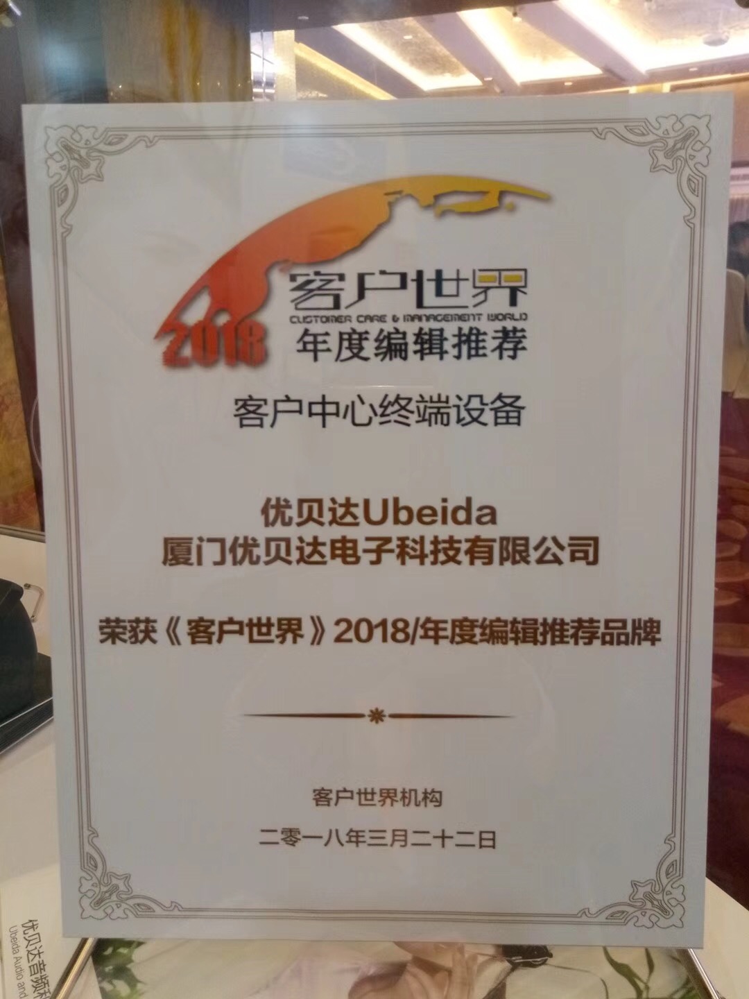 优贝达Ubeida(厦门优贝达电子科技有限公司)荣获《客户世界》2018年度编辑推荐(客户中心终端设备大类)标杆品牌。
