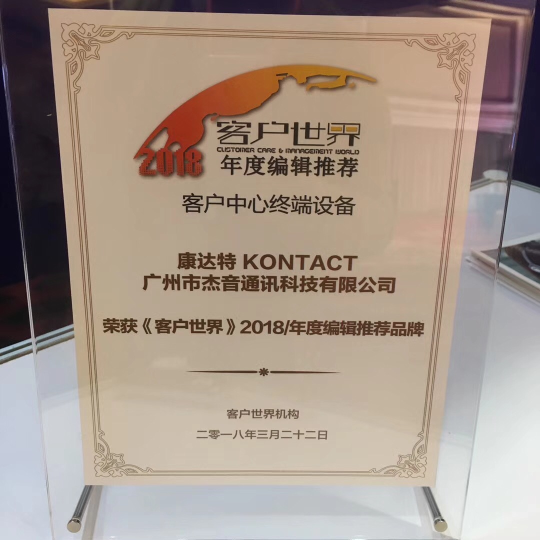 康达特 KONTACT( 广州市杰音通讯科技有限公司 )荣获《客户世界》2018年度编辑推荐(客户中心终端设备大类)标杆品牌。