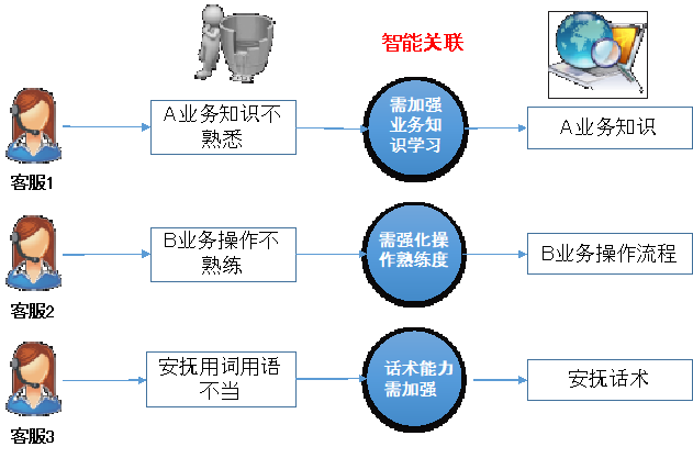 所有客服人员总是经过反复的培训、实践、学习才能慢慢成为一名优秀的客服。相信在很多企业中,都会设定一定的考核指标来对客服的服务能力进行考核,也会安排一些相关的培训课程来进行强化提升。就我们与各类企业的呼叫中心合作过程中了解到的,在对客服的学习提升方面存在两个比较明显的问题:(1)服务能力短板发现的及时性,对于客服人员而言,有时候对自身能力缺陷的发现并不自知,往往都需要借助外部力量来提醒和强制改进。对于客服中心来说,一般都会通过定期的服务质检去检验服务质量问题,但有时候发现问题后,未必能够及时地对每一个服务人员提供非常有针对性的服务提升建议;(2)目前对于客服人员的培训,主要方式还是通过以老带新的两人模拟方式进行训练,这其实很受到时间空间和人员的限制,培训未必能够及时和全面。