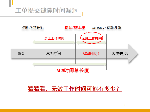 不过在ACW时间的全部长度范围内,座席还有另一个独立的操作,即提交工单或来电小结。这一操作将ACW时间划分为两部分,前一部分时间是在提交工单之前,这必然是员工正在编辑工单的工作时间,它应该占据了话务系统统计出的ACW时间的绝大部分,后一部分时间是在提交工单之后,这时座席已经没有任何工作需要处理,应该快速点击“就绪”按钮,等候接听下一通客户来电,其时间占比应该很小。但若是座席不及时点击“就绪”,长期停留在ACW时间范围而不进行任何工作,这就是在利用工单提交缝隙时间漏洞了。