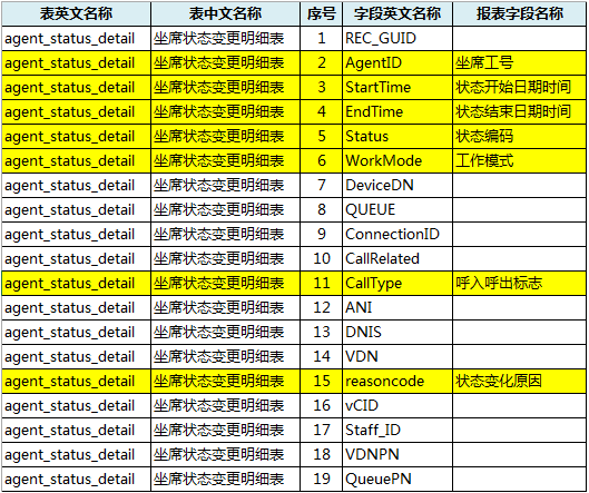 大部分客户服务中心话务系统的数据结构是相通的。如图4所示,话务系统中一定有一张独立的、庞大的流水表记录所有员工的状态变化流水。在这张表中,每一次员工状态变化都会形成一条独立的时间碎片记录。由于数据量庞大,我们仅需要截取与效能指标重算相关的数据字段纳入后续处理,在本案中就是图四中标黄的数据字段。