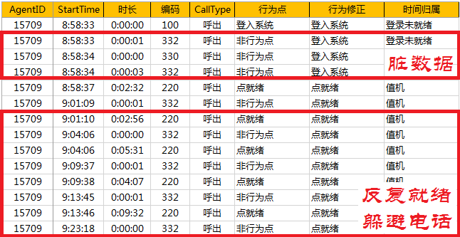 其一,是通过话务系统中员工状态变化表结合其他外部数据(比如需要工单流水表参与工单提交缝隙时间漏洞的计算)进行精细化分析计算,对员工每一次行为带来的时间碎片标记、修正并且汇总统计。