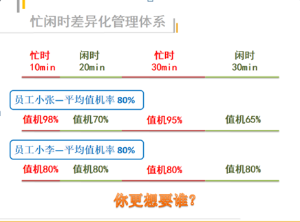 员工小张钉在座位上一刻不停地为客户提供服务,在忙时极限输出得到了98%、95%的忙时值机率,然而在话务闲时小张打水、小休、查阅支持库,分别只有70%、60%的值机率。