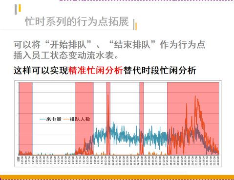 如图3所示,忙闲效能指标计算就好像是给全天的24小时打上了10分钟一段的时间筛,然后用客户的平均队列长度过滤出最忙的一些时间段,进而专注于考核并管理这些时间段的员工工作表现,也就是图三中的红色区域。