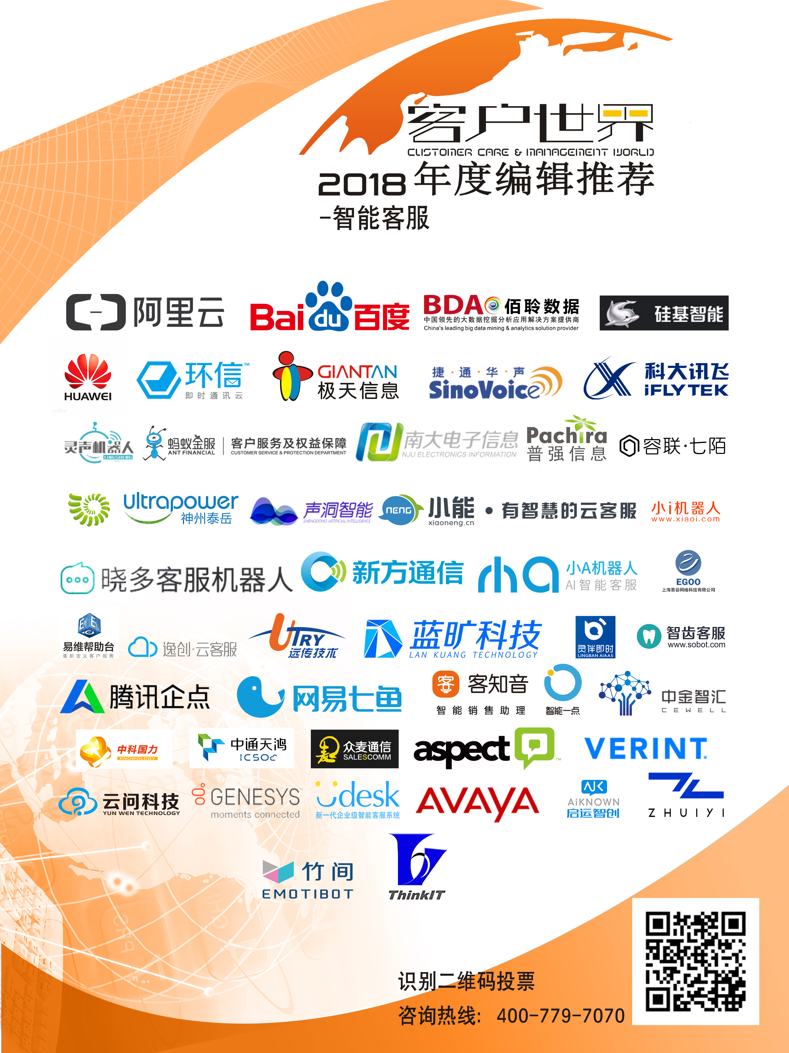 百度AI,蚂蚁金服-客户服务及权益保障,腾讯企点,阿里云,科大讯飞,AVAYA,华为,GENESYS,Aspect,新方通信,小I机器人,追一科技,环信移动客服,网易七鱼,小能,智齿科技,容联七陌,逸创云客服,Udesk,灵伴科技,神州泰岳-鼎富科技,远传信息,捷通华声,中科信利,普强信息,一号互联(小A机器人),硅基智能,灵声机器人,声洞智能,易维帮助台,智合大方(客知音),智能一点,佰聆数据,蓝旷智能,中金智汇,启运智创,极天信息,中通天鸿,新方通信,三地信息,南大电子,晓多客服机器人,易谷,中科国力,众麦通信,云问科技,竹间