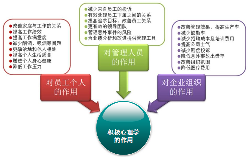 积极心理学能通过改善员工认知来改善员工家庭与工作的关系,从而提高工作绩效和工作满意度,另外可以减少员工因情绪不良造成的酗酒、吸烟等问题,从而能够更融洽地和他人相处,提高个人生活质量,增进个人身心健康,降低工作压力。