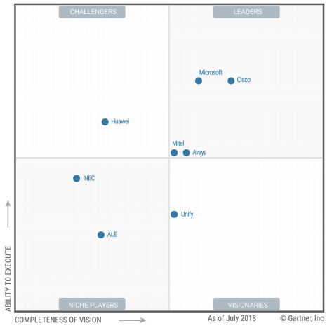 2018年统一通信魔力象限报告评估了8家统一通信供应商的愿景和执行能力的完整性,划分为四个象限:远见者、利基者、挑战者和领导者。Gartner把“统一通信解决方案定义为包括设备、软件和服务在内的产品总和,帮助企业实现通信渠道(媒体)、网络和系统, IT业务应用,以及特定情况下的消费级应用和设备集成。Gartner将统一通信划分为六大产品领域:电话、会议解决方案、消息传递、呈现和即时消息、客户端和支持通信的业务流程。