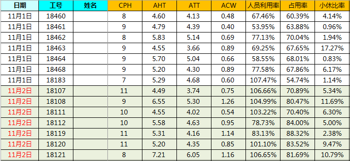 在数据输入页签,该工具以数据时间和员工工号为联合主键,依次输入不同时间周期的员工指标数据即可。如图2所示,在数据输入环节输入了11月1日、2日所有员工的指标数据。
