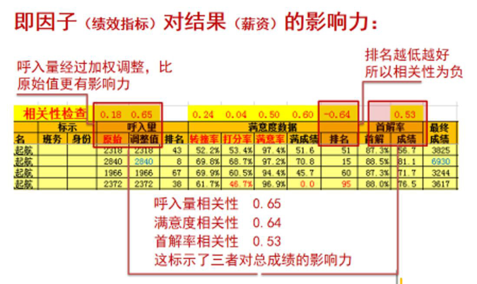在驱动力度方面可使用绩效考核指标与绩效工资或绩效总成绩的相关性系数来进行量化评估,不同的绩效考核指标和绩效总成绩的相关性系数必然是有差异的,这取决于绩效成绩的算法、绩效成绩的分布情况与当时的业务发展状况。然而从员工角度是不会过多关注算法的科学性、业务发展的状况,其关注点一定是通过怎样的努力能够获得更多的绩效工资回报,于是与总成绩相关性系数较大的指标项是要优先关注与提升的,这种对绩效指标项的在意程度就是我们需要量化测量的绩效驱动力度。