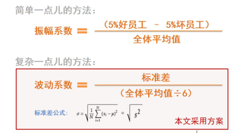 在驱动结果方面可以使用员工绩效指标的振幅系数或波动系数来进行量化评估,振幅系数的计算比较简单,用排名在头尾两端员工的实际达成值与全员平均值做比较就可以得到振幅系数,但由于振幅系数只采信了头尾两端的少量数据而容易出现一些数据偏差。波动系数的计算则更加客观,它使用全局平均数与平均值比较,所有员工的数据表现均计算在内,不会受到个别员工的极端值影响,数据结果非常稳定可靠,所以在数据驱动力课程及咨询项目中均使用波动系数来度量驱动结果的好坏。