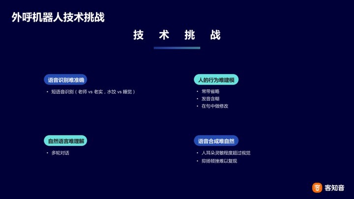 首先是语音识别技术的挑战,前面说到实验室环境下语音识别准确率已经从2013年的87%提高到了2017年的97%,而在实际环境中,这个数字会降低到85%左右,因为实际环境中有大量的噪音、口音、声源远近等问题。在外呼机器人这个领域,短语音识别是一个难点,因为在缺少更多上下文信息的时候,语音识别很难确定你发的音和对应的字之间的关系,中文更是如此,因为中文是一个同音不同字的语言,还有音调的变化,比如我发一个音“lao shi” ,这在不同的语境下,可能代表这是一个教书育人的职业,在另外的语境下,可能代表这个人的性格很老实。