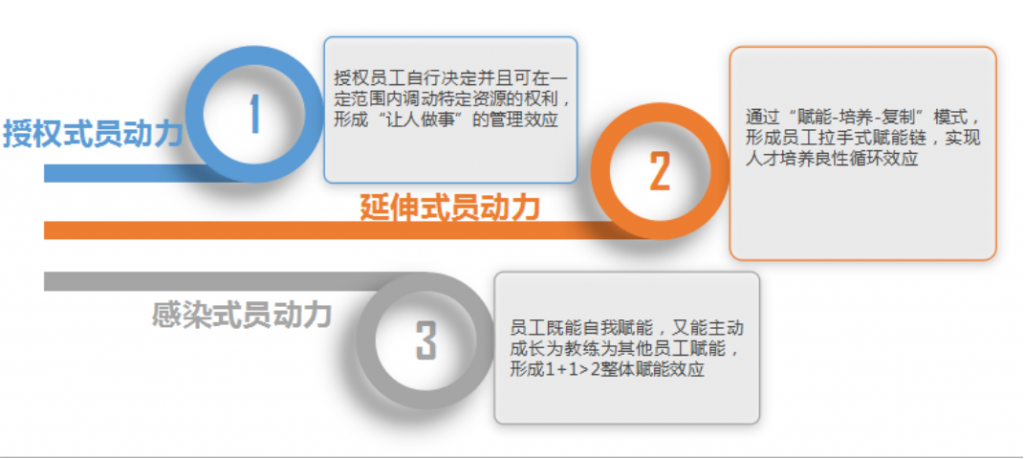 三是“感染式员动力”。通过典型力量塑造来形成员动力的良好氛围,员工不仅具备自我赋能的意愿和行动,更能够主动成长为教练去帮助其他员工赋能,如此一来,每名员工既是能量的吸收者,又是能量的发源地,形成1+1>2的整体赋能效应。