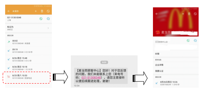 邮件发完,该干啥干啥,好歹家里人没吃到不熟的鸡肉,我也没啥不良反应,估计也没啥机会像美国案例一样赔个百八十万美元,这件事情就这样吧。有意思的是,五天之后的8月25日,麦当劳找我了。位于上海的服务中心使用上海区号的固话拨打我的电话,当然被我拒接了——因为很像营销推广电话号码。然后马上麦当劳就短信提醒我这是个正经号码请注意接听,算是整个流程难得的亮点了。随后进入正式流程——核实身份了解情况确认投诉成立通知我会交给当地餐厅跟进。非常紧凑的8分钟后,当地餐厅致电给我了。