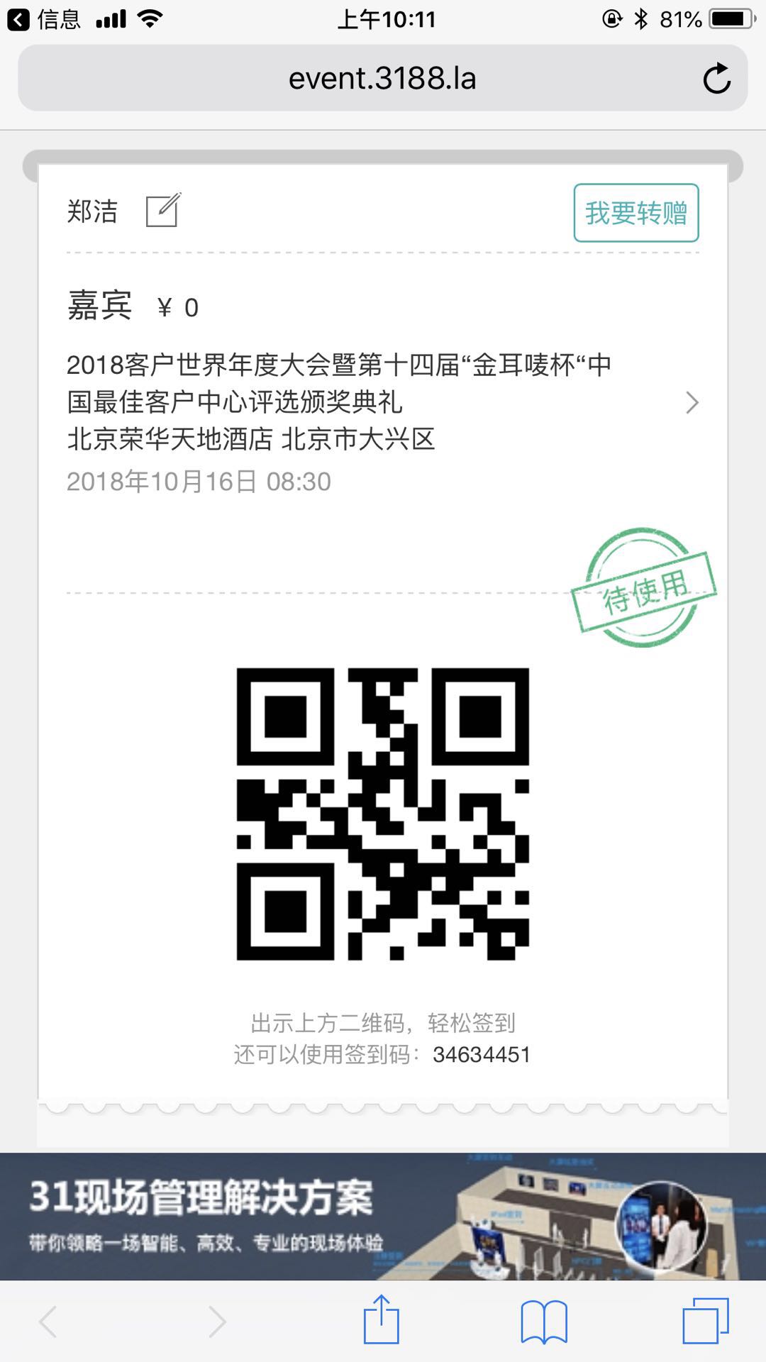 收到短信后点击链接后显示如下图下:(如您临时有事来不了会场,可以将门票转赠,点击“我要转赠,并填写参会人信息即可)
